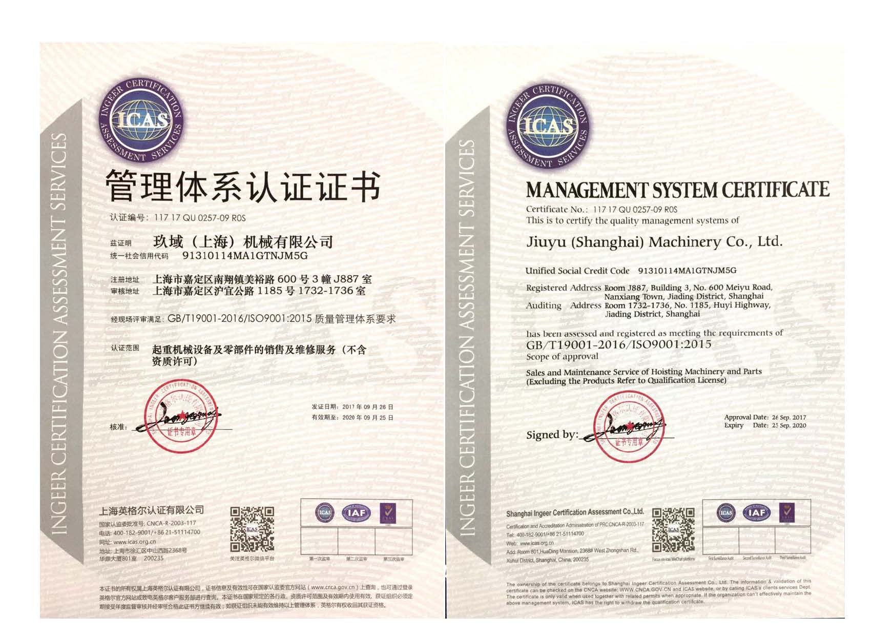 文章作者:玖域(上海)機(jī)械有限公司 上傳更新:2017-09-27公司于2017年初與上海英格爾認(rèn)證機(jī)構(gòu)接洽擬申請(qǐng)ISO9001認(rèn)證。前期雙方充分溝通,公司按照ISO9001認(rèn)證相關(guān)要求進(jìn)行文件整理、流程制定、內(nèi)部自檢等準(zhǔn)備工作。上海英格爾認(rèn)證機(jī)構(gòu)審核老師于9月21日-22日至公司及用戶現(xiàn)場(chǎng)審核,經(jīng)過(guò)兩天細(xì)致嚴(yán)謹(jǐn)?shù)膶彶?,一致認(rèn)為公司的質(zhì)量管理及相關(guān)流程符合ISO9001:2015體系要求。公司于2017年9月26日順利取得英格爾認(rèn)證機(jī)構(gòu)ISO9001:2015質(zhì)量管理體系認(rèn)證證書(shū)!